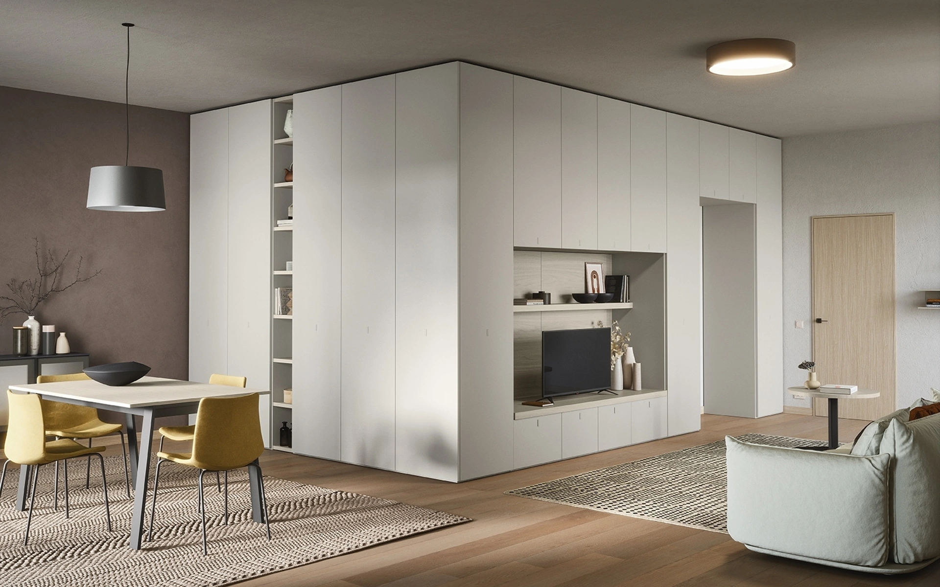 Anche in un soggiorno non generoso, questo tipo di arredo riesce a organizzare al meglio gli spazi usufruendo al meglio di ogni angolo e assicurando l'alta componibilità tipica delle soluzioni moderne. Questo modello costituisce tutta l'eccellenza che il brand garantisce grazie a pluriennale esperienza e grande dedizione nel campo dell'arredo e del design. La Parete Attrezzata 05C di Cinquanta3 nell'immagine, realizzata in melaminico, risolve le più particolari problematiche abitative di spazio e stile senza rinunciare alla ricerca stilistica. Se cerchi arredi salvaspazio e realizzabili su misura per te, contattaci e ottieni informazioni sull'Arredamento Casa delle migliori marche.